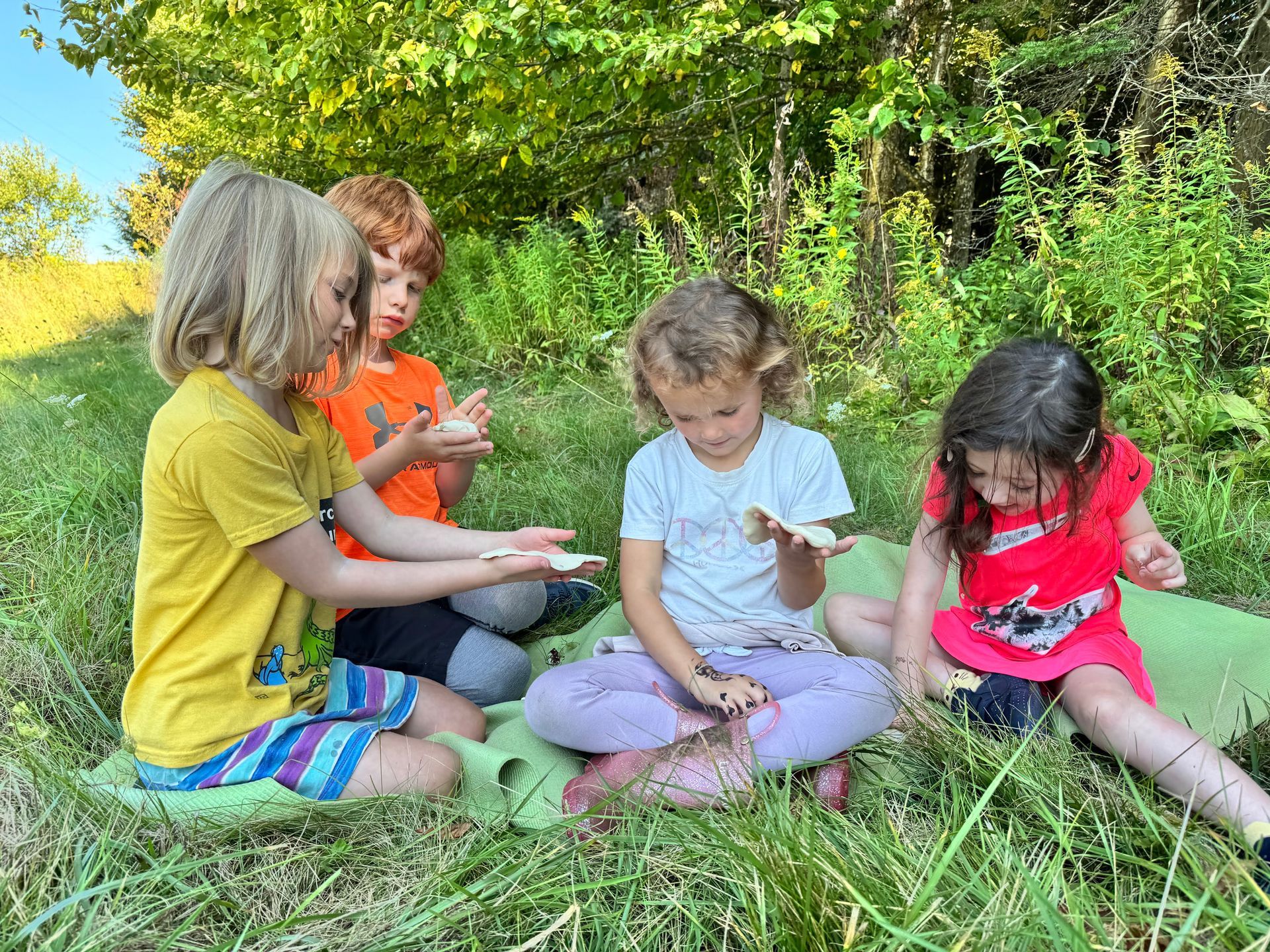 Kindergarteners Mae and Charlie, and Preschoolers Sophia and Sawyer worked together with play dough as they got comfortable in one of their new outdoor learning areas during Pine Pals time.