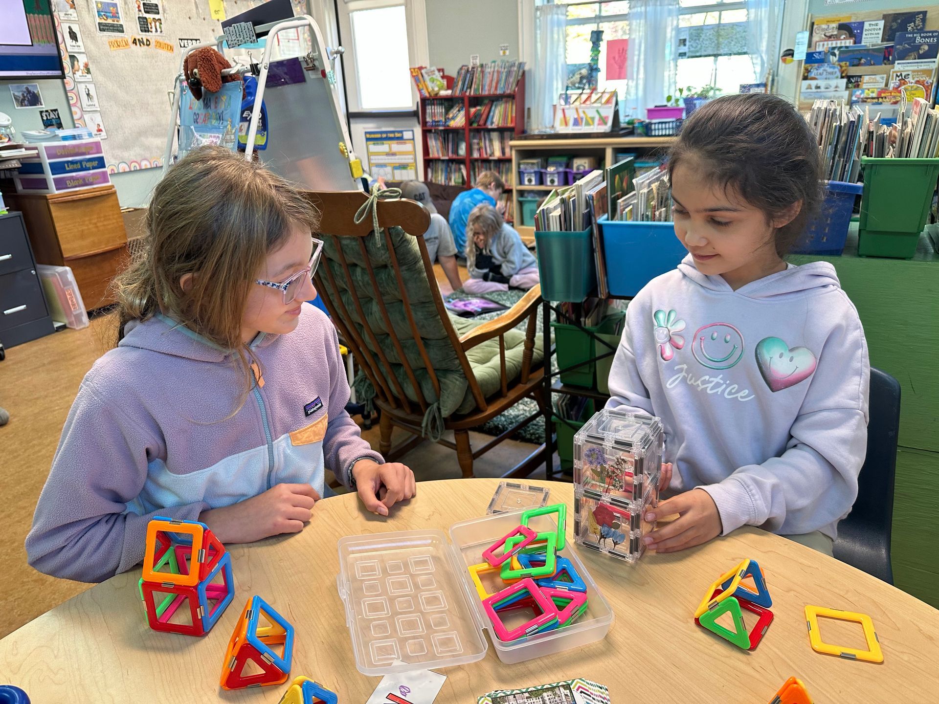 5th grader Violet and 2nd grader Ruslana worked together last week on a construction challenge after reading a related picture book together.