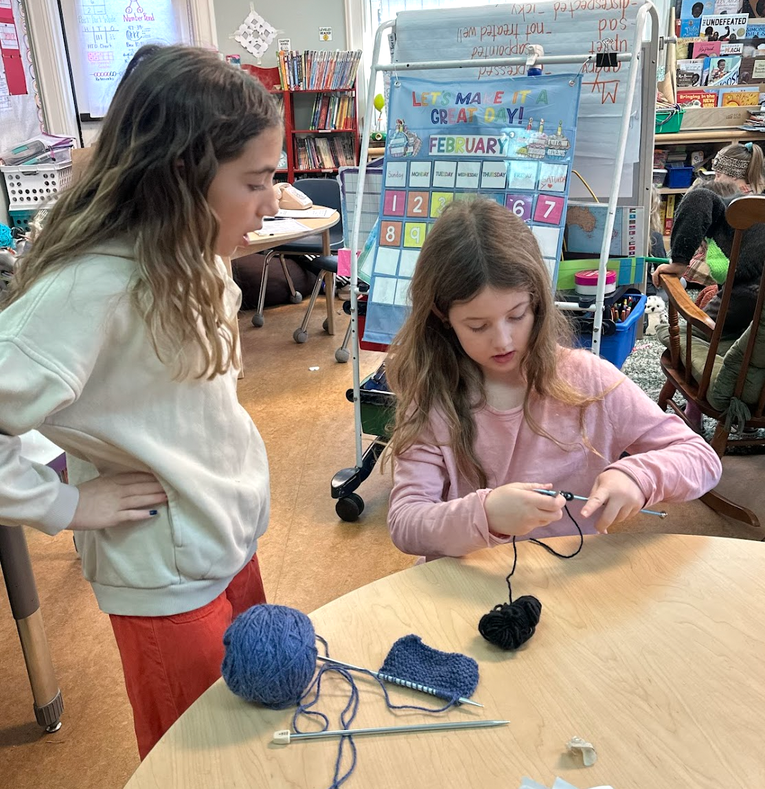 5th grader Bryn helped 2nd grader Lila cast yarn onto a needle and knit.